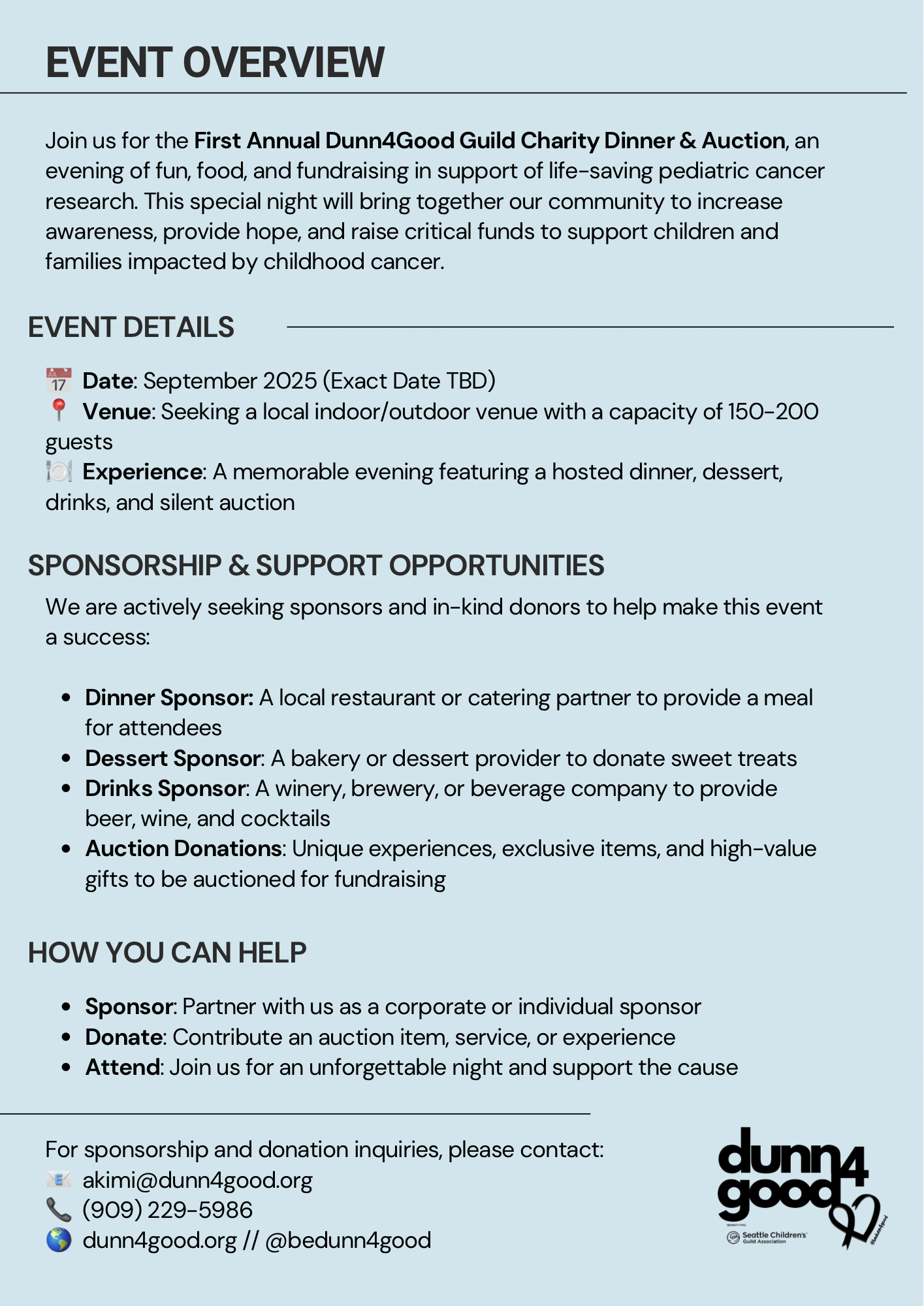 Event flyer for Dunn4Good Guild Charity Dinner & Auction, details about date, venue, experience, sponsorship and support opportunities, and contact information.